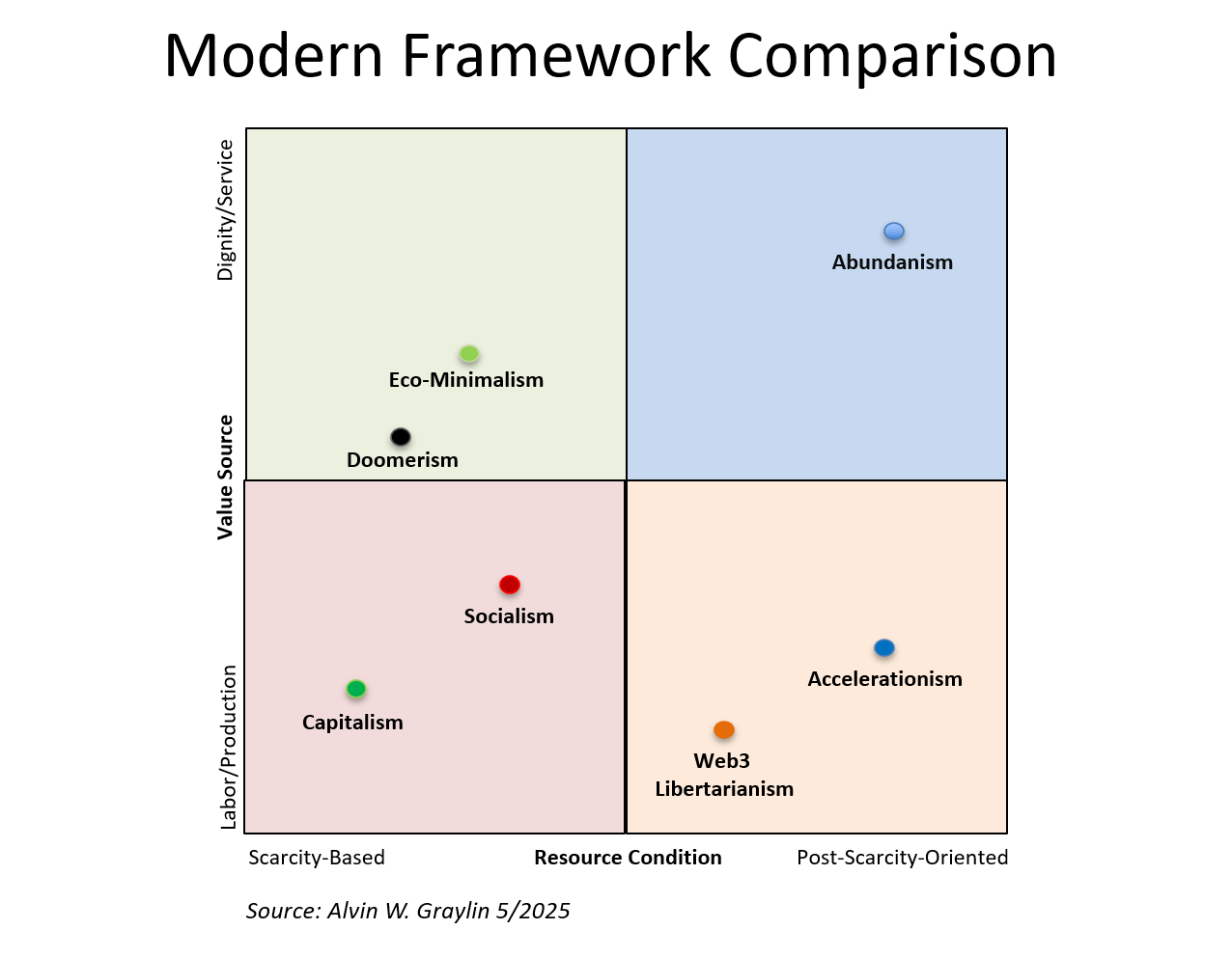 Most modern ideological frameworks are artifacts of the scarcity era. They served their historical purposes — but no longer map to the world we are entering. Let’s examine six prevalent models today and why they no longer align with a post-scarcity world. (See summary chart in Fig. 2)