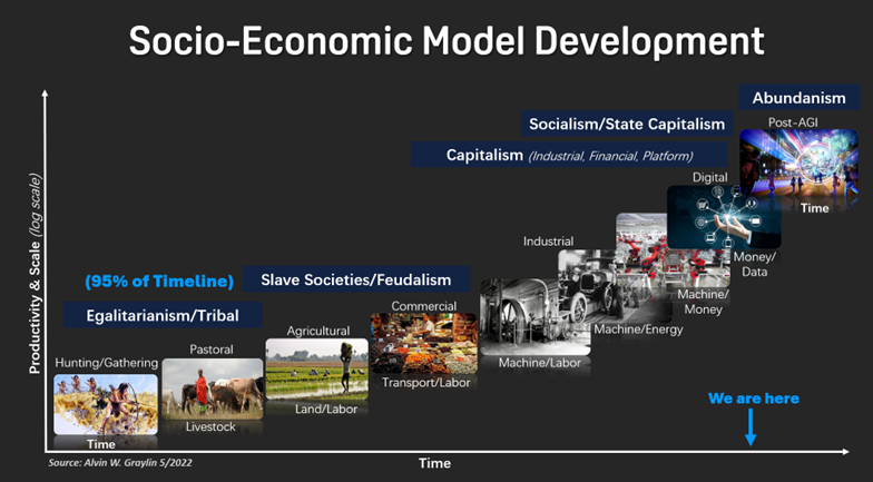 Throughout history, societies globally have developed through multiple socio-economic models, each bringing increased productivity and scale of impact by applying new technologies and forms of labor. (See Fig. 1) Over the last two thousand years after the invention of agrarian societies, it’s estimated we’ve become approximately 10,000X more productive, and most of that has happened over the last 200 years. In each phase we’ve had some form of resource scarcity, and that resource has been the core to value creation and a key source of human conflict.